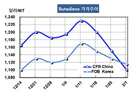 부타디엔 시세는 2월1일 FOB Korea 톤당 1115달러로 15달러 하락했으나 CFR SE Asia는 1050달러로 50달러 급락했다. CFR China 역시 1100달러로 50달러 급락했다.