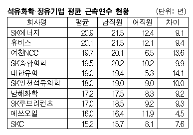 전체 직원 평균 근속연수는 SK에너지에 이어 휴비스 20.1년, 여천NCC 19.7년, SK종합화학 19.5년, 대한유화19년 등이 뒤를 이었다.