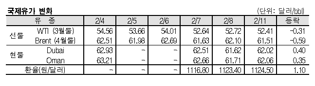 2월11일 국제유가는 미국-중국 무역협상 관련 우려 지속, 미국 달러화 강세, 미국의 쿠싱 지역 원유 재고 증가 등의 영향으로 하락했다. 2월11일 국제유가는 미국과 중국의 무역협상과 관련된 우려가 계속되면서 하락했다. 표, 그래프: <국제유가 변화> <화학저널 2019/02/12> |