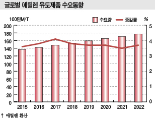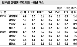 일본 경제산업성이 발표한 석유화학 중장기 전망에 따르면, 에틸렌(Ethylene)계 유도제품은 2016-2022년 세계 수요가 연평균 3.7%, 생산능력은 3.4% 증가할 것으로 예상되고 있다.