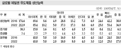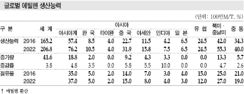 세계 에틸렌(모노머) 생산능력은 2016년 1억6520만톤에서 2022년 2억680만톤으로 4160만톤 늘어나 연평균 증가율이 3.8%에 달할 것으로 예상된다.
