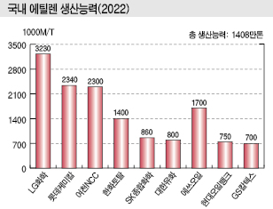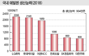 한국석유화학협회에 따르면, 국내 에틸렌 생산능력은 2018년 기준 LG화학 220만톤, 롯데케미칼 214만톤, 여천NCC 195만톤, 한화토탈 109만톤, SK종합화학 86만톤, 대한유화 80만톤으로 총 904만톤에 달하고 있다.