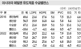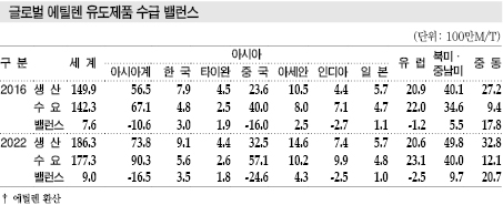 반면, 북미는 생산능력 확대가 본격화되며 2022년 공급과잉이 1114만톤으로 2016년에 비해 2배 정도 늘어날 것으로 분석된다.