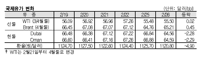 2월26일 국제유가는 OPEC(석유수출국기구)와 비OPEC의 감산정책 고수, 미국 달러화 약세 등의 영향으로 상승했다. 2월26일 국제유가는 OPEC+가 미국 트럼프 대통령의 비판에도 감산정책을 고수함에 따라 상승했다. 표, 그래프: <국제유가 변화> <화학저널 2019/02/27> |