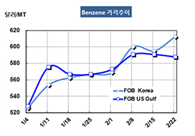 벤젠(Benzene)은 600달러를 넘어섰다. 벤젠 시세는 2월22일 FOB Korea 톤당 613달러로 18달러 상승했고 FOB SE Asia도 584달러로 19달러 올랐다. CFR Taiwan은 618달러로 16달러 상승했다. 표, 그래프: <Benzene 가격추이> <화학저널 2019/02/27> |