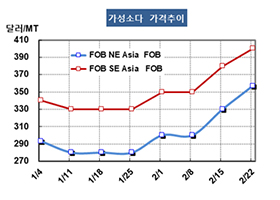 가성소다(Caustic Soda)는 300달러대 중반을 넘어섰다. 가성소다 시세는 2월21일 FOB NE Asia 톤당 357달러로 27달러 급등했고 CFR SE Asia도 400달러로 20달러 상승했다. 표, 그래프: <가성소다가격추이> <화학저널 2019/02/27> |
