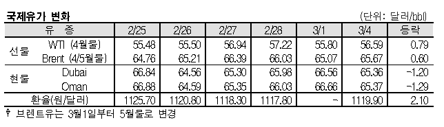 3월4일 국제유가는 미국-중국 무역협상 타결 임박, OPEC(석유수출국기구)의 2월 원유 생산량 감소 예상, 러시아의 감산 준수 방침 등의 영향으로 상승했다.