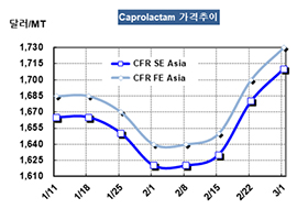 CPL(Caprolactam)은 상승세를 유지했다. CPL 시세는 2월28일 CFR FE Asia 톤당 1730달러로 30달러 상승했고 CFR SE Asia도 1710달러로 30달러 올랐다. 표, 그래프: <Caprolactam 가격추이> <화학저널 2019/03/07> |