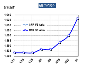 AN(Acrylonitrile)은 급등현상을 이어갔다. AN 현물시세는 3월1일 CFR FE Asia 톤당 1630달러로 50달러 급등했고 CFR SE Asia도 1630달러로 50달러 올랐다. 표, 그래프: <AN 가격추이> <화학저널 2019/03/07> |