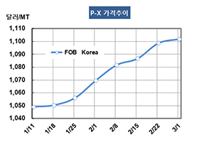 P-X(Para-Xylene)는 3월 ACP(아시아 계약가격)가 CFR Asia 톤당 1080달러로 확정됐다.
