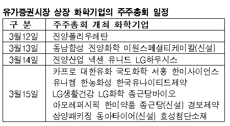 한국예탁결제원은 3월 셋째 주(10-16일)에 정기 주주총회를 여는 상장기업이 120개로 집계됐다고 3월6일 발표했다. 표, 그래프: <유가증권시장 상장 화학기업의 주주총회 일정> <화학저널 2019/03/07> |