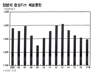 일본이 온실가스 배출량 감축에 박차를 가하고 있다. 표, 그래프: <일본의 온실가스 배출동향> <화학저널 2019/03/08> |