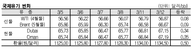3월12일 국제유가는 사우디의 원유 생산량 축소 계획, 미국 달러화 약세, 미국 원유 생산량 증가세 둔화 전망 등의 영향으로 상승했다. 3월12일 국제유가는 사우디가 4월 원유 생산량을 축소하겠다고 밝힘에 따라 상승했다. 표, 그래프: <국제유가 변화> <화학저널 2019/03/13> |
