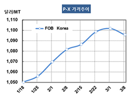 P-X(Para-Xylene)는 1100달러가 무너졌다. P-X 시세는 3월8일 FOB Korea 톤당 1096달러로 6달러 하락했고 CFR SE Asia도 1102달러로 6달러 떨어졌다. CFR China 역시 1115달러로 6달러 하락했다. 표, 그래프: <P-X 가격추이> <화학저널 2019/03/14> |