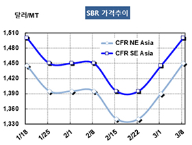 SBR(Styrene Butadiene Rubber)은 연속 급등했다. SBR 시세는 3월7일 CFR NE Asia 톤당 1450달러로 60달러 급등했고 CFR SE Asia 역시 1500달러로 55달러 급등했다. 표, 그래프: <SBR 가격추이> <화학저널 2019/03/15> |