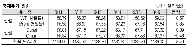 3월18일 국제유가는 공동감산점검위원회의 4월 회의 취소 결정, 사우디의 1월 원유 수출 및 생산 감소, 미국 쿠싱지역 원유 재고 감소 추정, 미국의 원유 생산량 증가세 둔화 전망, 미국 달러화 가치 하락 등의 영향으로 상승했다. 3월18일 국제유가는 감산 참여 산유국들의 회의가 취소됨에 따라 상승했다. 표, 그래프: <국제유가 변화> <화학저널 2019/03/19> |