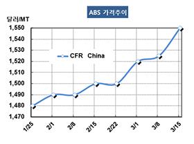 ABS(Acrylonitrile Butadiene Styrene)는 1500달러대에서도 상승행진을 계속하고 있다.