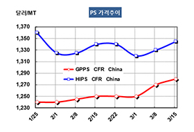 GPPS(General Purpose PS) 시세는 3월13일 CFR China 톤당 1280달러로 10달러 상승했고 CFR SE Asia는 1310달러로 10달러 올랐다. HIPS(High Impact PS)는 CFR China가 1345달러로 15달러, CFR SE Asia는 1370달러로 20달러 상승했다.