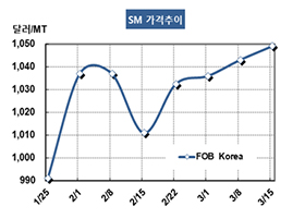 SM(Styrene Monomer)은 1000달러대 중반 등락을 계속하고 있다. SM 시세는 3월15일 FOB Korea 톤당 1049달러로 6달러 상승했고 FOB SE Asia는 1079달러로 6달러 올랐다. CFR India 역시 1082달러로 6달러 상승했다. 표, 그래프: <SM 가격추이> <화학저널 2019/03/20> |