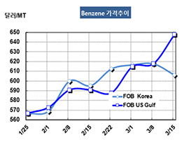 벤젠(Benzene)은 600달러가 위험해지고 있다. 벤젠 시세는 3월15일 FOB Korea 톤당 606달러로 12달러 하락했고 FOB SE Asia 역시 578달러로 13달러 떨어졌다. CFR China는 608달러로 15달러 하락했다. 표, 그래프: <Benzene 가격추이> <화학저널 2019/03/20> |