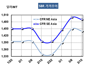 SBR(Styrene Butadiene Rubber)은 강세가 누그러졌다. SBR 현물시세는 3월14일 CFR NE Asia 톤당 1440달러로 10달러 하락했고 CFR SE Asia 역시 1490달러로 10달러 떨어졌다. 표, 그래프: <SBR 가격추이> <화학저널 2019/03/22> |