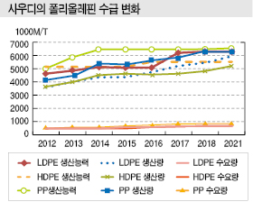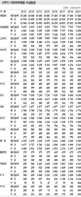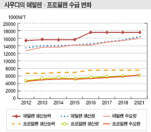 사우디에서는 13사가 에틸렌 크래커를 가동하고 있으며 총 생산능력은 1700만톤으로 파악되고 있다.