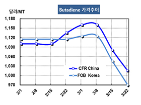 부타디엔(Butadiene)은 폭락세가 멈추지 않고 있다. 부타디엔 시세는 3월22일 FOB Korea 톤당 970달러로 75달러 폭락했고 CFR SE Asia는 965달러로 65달러 폭락했다. CFR China 및 CFR NE Asia도 1015달러로 65달러 폭락했다. 표, 그래프: <Butadiene 가격추이> <화학저널 2019/03/26> |