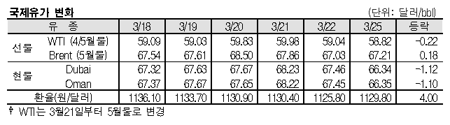 3월25일 국제유가는 브렌트유(Brent) 기준으로 미국의 원유 재고 감소, 사우디의 하반기 감산 시사, 미국 달러화 약세 등의 영향으로 상승했다. 3월25일 국제유가는 미국의 원유 재고가 감소한 영향으로 상승했다. 표, 그래프: <국제유가 변화> <화학저널 2019/03/26> |