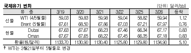 3월26일 국제유가는 미국의 원유 재고 감소, 베네주엘라의 원유 생산 및 수출차질 등의 영향으로 상승했다. 3월26일 국제유가는 미국의 원유 재고가 감소한 영향으로 상승했다. 표, 그래프: <국제유가 변화> <화학저널 2019/03/27> |
