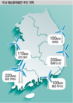 전북 군산 말도 인근(110MW급), 전남 영광 안마도 인근(220MW급), 경북 영덕군 인근(100MW급), 경남 통영 욕지도 인근(100MW급), 울산 동해가스전 주변(200MW급) 등으로 총 730MW에 달하고 있다.
