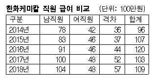 한화케미칼(대표 김창범)은 여직원 평균 급여가 몇년째 남직원 절반을 밑돌았다. 표, 그래프: <한화케미칼 직원 급여 비교> <화학저널 2019/04/16> |