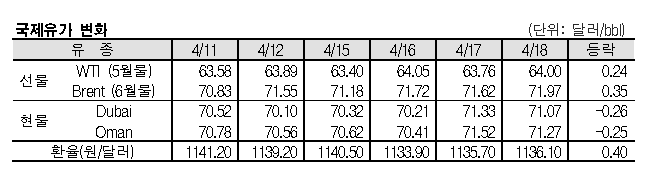 4월18일 국제유가는 사우디의 원유 수출량 감소, 미국의 원유 시추리그 수 감소, 미국의 소매판매 증가 등의 영향으로 상승했다.