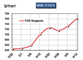 MTBE(Methyl tert-Butyl Ether)는 700달러대 중반으로 올라섰다.