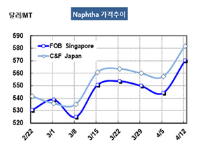 표, 그래프: <Naphtha 가격추이> <화학저널 2019/04/19> |