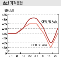 아시아 가격은 1월 중순 800달러를 저점으로 상승하기 시작해 1월 하순에는 춘절 직전의 수요를 타고 수급이 소폭 타이트해지면서 30달러 가량 상승했고 2월 하순에도 중국가격의 영향을 받아 추가로 30달러 정도 올랐다.