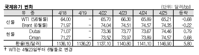 4월25일 국제유가는 원유 선물 차익실현 매물 출회, 미국의 원유 재고 증가, 미국 달러화 강세 등의 영향으로 하락했다. 4월25일 국제유가는 원유 선물차익 실현매물이 출회한 영향으로 하락했다. 표, 그래프: <국제유가 변화> <화학저널 2019/04/26> |