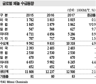 글로벌 수요는 일본이 62만톤으로 9.7%, 일본을 제외한 아시아가 529만톤으로 8.9% 신장했으나 미국은 182만톤으로 0.1%, 기타는 73만톤으로 1.5% 증가에 그쳤고 유럽은 186만톤으로 0.9% 감소했다.