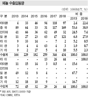 수출은 4만톤으로 33.0%, 수입은 32만톤으로 3.0% 감소했다.