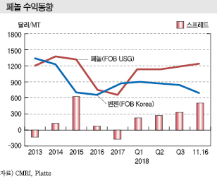 그러나 2018년 1분기에는 페놀 1123달러, 벤젠 891달러로 스프레드가 플러스 232달러로 벌어졌고 4분기에는 페놀 1211달러, 벤젠 712달러로 499달러에 달했다.