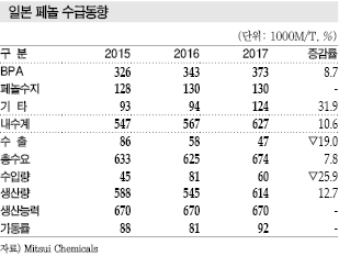 BPA용 수요는 2013년 70만톤에서 2017년 91만5000톤으로 크게 늘어났다. BPA의 주요 수요처인 에폭시수지 및 PC 생산 증가에 따른 것으로, BPA는 에폭시용으로 30%, PC용으로 67% 투입되고 있다.