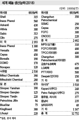 따라서 페놀의 최대 수요처인 BPA 생산능력은 금호P&B화학 45만톤, LG화학 45만톤, 삼양이노켐 15만톤 등 2018년 1050만톤에 달했으며 가동률이 95%에 육박하고 있다.