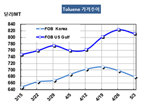 표, 그래프: <Toluene 가격추이> <화학저널 2019/05/08> |