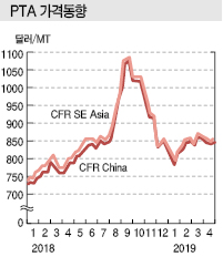 중국의 폴리에스터(Polyester) 장섬유 메이저 Xin Feng Ming이 PTA(Purified Terephthalic Acid) 생산능력을 440만톤으로 확대한다. 표, 그래프: <PTA 가격동향> <화학저널 2019년 5월 13·20일> |