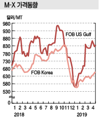 M-X(Mixed-Xylene)는 공급과잉 전환이 확실시되고 있다. 표, 그래프: <M-X 가격동향> <화학저널 2019년 5월 13·20일> |