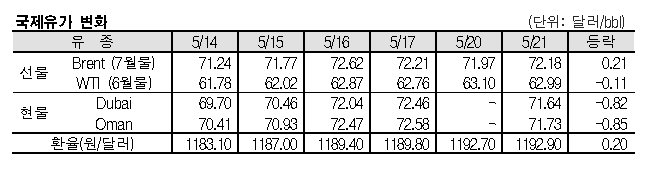 5월21일 국제유가는 브렌트유(Brent) 기준으로 미국-이란의 갈등 지속, 나이지리아의 원유 송유관 폐쇄 등의 영향으로 상승했다. 5월21일 국제유가는 미국과 이란의 갈등이 계속 영향을 미치면서 상승했다. 표, 그래프: <국제유가 변화> <화학저널 2019/05/22> |