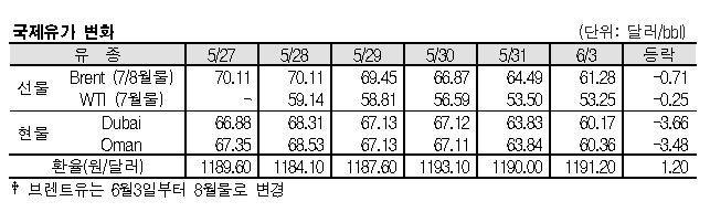 6월3일 국제유가는 미국의 관세 부과 및 인상 조치에 따른 세계경기 침체 우려 등으로 하락했다. 6월3일 국제유가는 미국이 중국, 멕시코를 상대로 무역전쟁을 펼침에 따라 세계경기가 침체될 것이라는 우려가 확산되면서 하락했다. 표, 그래프: <국제유가 변화> <화학저널 2019/06/04> |