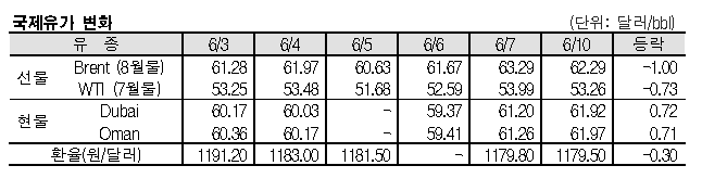 6월10일 국제유가는 미국-중국 무역분쟁, 러시아의 감산 연장 불확실성 고조, 중국의 5월 원유 수입량 감소, 미국 달러화 강세 등의 영향으로 하락했다. 6월10일 국제유가는 미국-중국 무역분쟁에 영향을 받아 하락했다. 표, 그래프: <국제유가 변화> <화학저널 2019/06/11> |
