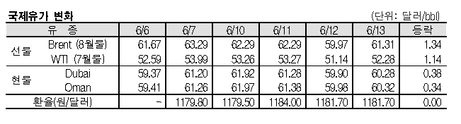6월13일 국제유가는 오만 해상의 유조선 피격 발생 등 중동지역의 위기 재점화에 영향을 받아 상승했다. 6월13일 국제유가는 중동지역의 위기가 재점화됨에 따라 상승했다. 표, 그래프: <국제유가 변화> <화학저널 2019/06/14> |