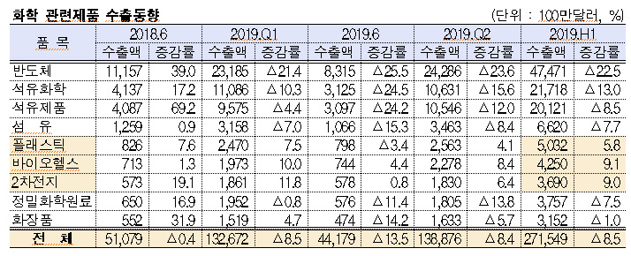 표, 그래프: <화학 관련제품 수출동향> <화학저널 2019/07/01> |