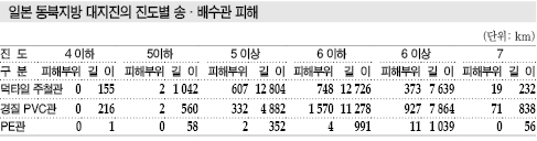 PVC(Polyvinyl Chloride) 파이프는 상수도 분야에서 채용이 확대될 것으로 예상된다. 표, 그래프: <일본 동북지방 대지진의 진도별 송·배수관 피해> <화학저널 2019년 7월 15일> |